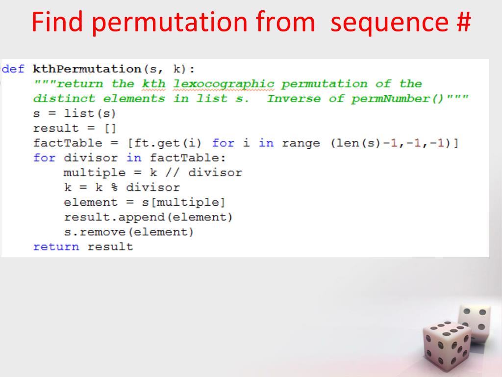 Permutations and order • Given a permutation of 0, 1, …, n-1, can we directly find the next permutation in the lexicographic sequence? • Given a permutation of 0..n-1, can we determine its permutation sequence number? • Given n and i, can we directly generate the ith permutation of 0, …, n-1?