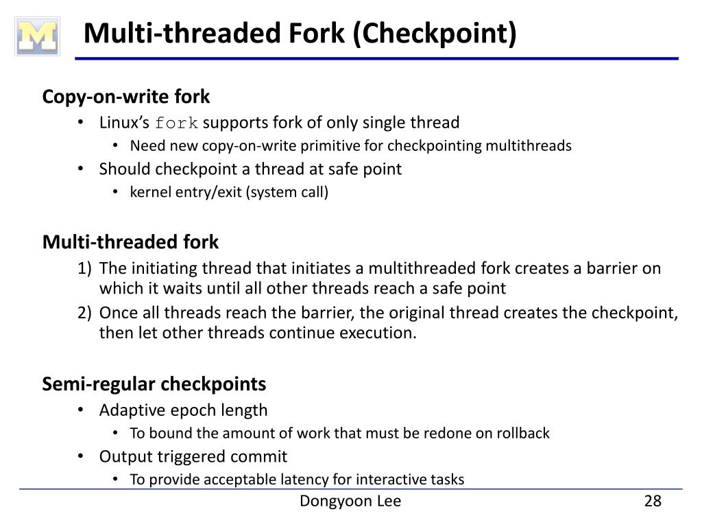 Multi-threaded Fork (Checkpoint) Copy-on-write fork • Linux’sfork supports fork of only single thread • Need new copy-on-write primitive for checkpointing multithreads • Should checkpoint a thread at safe point • kernel entry/exit (system call) Multi-threaded fork 1) The initiating thread that initiates a multithreaded fork creates a barrier on which it waits until all other threads reach a safe point 2) Once all threads reach the barrier, the original thread creates the checkpoint, then let other threads continue execution. Semi-regular checkpoints • Adaptive epoch length • To bound the amount of work that must be redone on rollback • Output triggered commit • To provide acceptable latency for interactive tasks