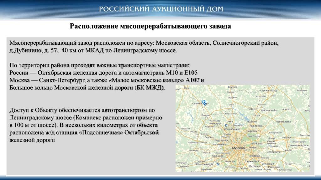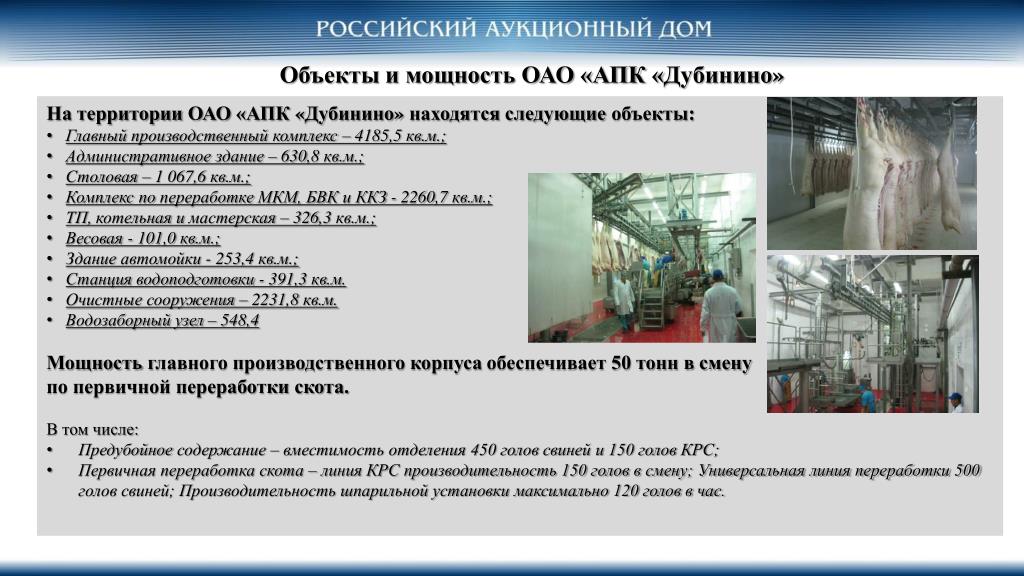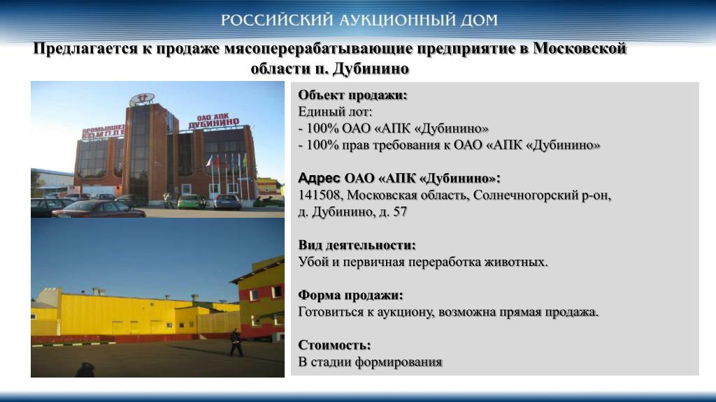 Предлагается к продаже мясоперерабатывающие предприятие в Московской области п. Дубинино • Объект продажи: • Единый лот: - 100% ОАО «АПК «Дубинино» • - 100% прав требования к ОАО «АПК «Дубинино» • Адрес ОАО «АПК «Дубинино»: • 141508, Московская область, Солнечногорский р-он, д. Дубинино, д. 57 • Вид деятельности: • Убой и первичная переработка животных. • Форма продажи: • Готовиться к аукциону, возможна прямая продажа. • Стоимость: • В стадии формирования