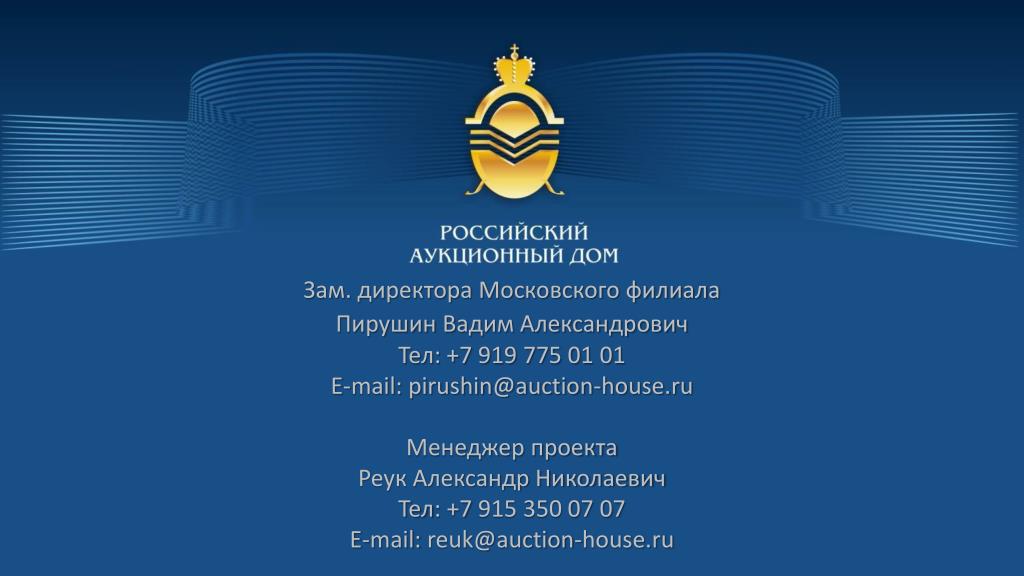 Зам. директора Московского филиала • ПирушинВадим Александрович • Тел: +7 919 775 01 01 • E-mail: pirushin@auction-house.ru • Менеджер проекта • Реук Александр Николаевич • Тел: +7 915 350 07 07 • E-mail: reuk@auction-house.ru