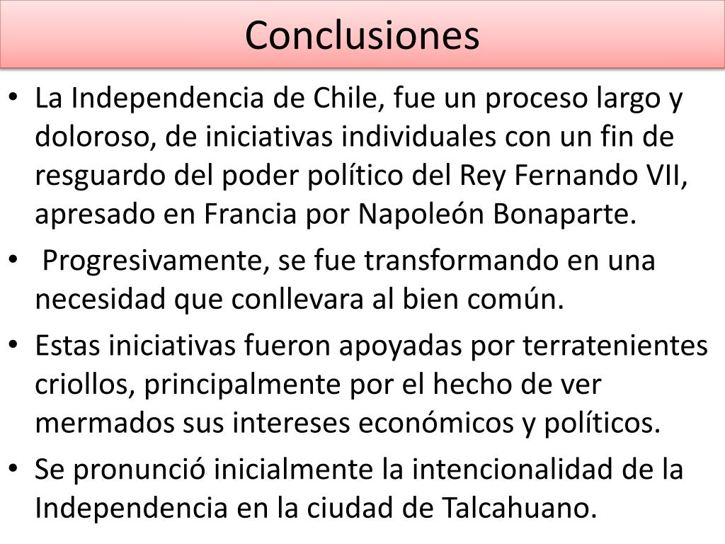 Conclusiones • La Independencia de Chile, fue un proceso largo y doloroso, de iniciativas individuales con un fin de resguardo del poder político del Rey Fernando VII, apresado en Francia por Napoleón Bonaparte. • Progresivamente, se fue transformando en una necesidad que conllevara al bien común. • Estas iniciativas fueron apoyadas por terratenientes criollos, principalmente por el hecho de ver mermados sus intereses económicos y políticos. • Se pronunció inicialmente la intencionalidad de la Independencia en la ciudad de Talcahuano.