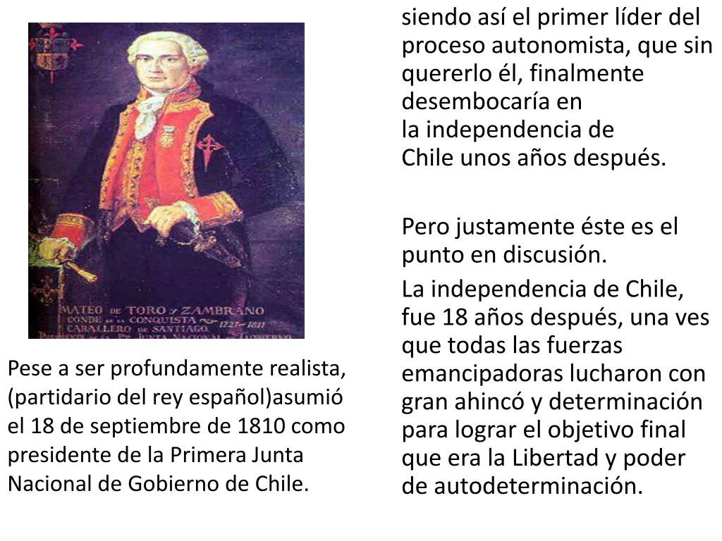 siendo así el primer líder del proceso autonomista, que sin quererlo él, finalmente desembocaría en la independencia de Chile unos años después. Pero justamente éste es el punto en discusión. La independencia de Chile, fue 18 años después, una ves que todas las fuerzas emancipadoras lucharon con gran ahincó y determinación para lograr el objetivo final que era la Libertad y poder de autodeterminación. Pese a ser profundamente realista, (partidario del rey español)asumió el 18 de septiembre de 1810 como presidente de la Primera Junta Nacional de Gobierno de Chile.