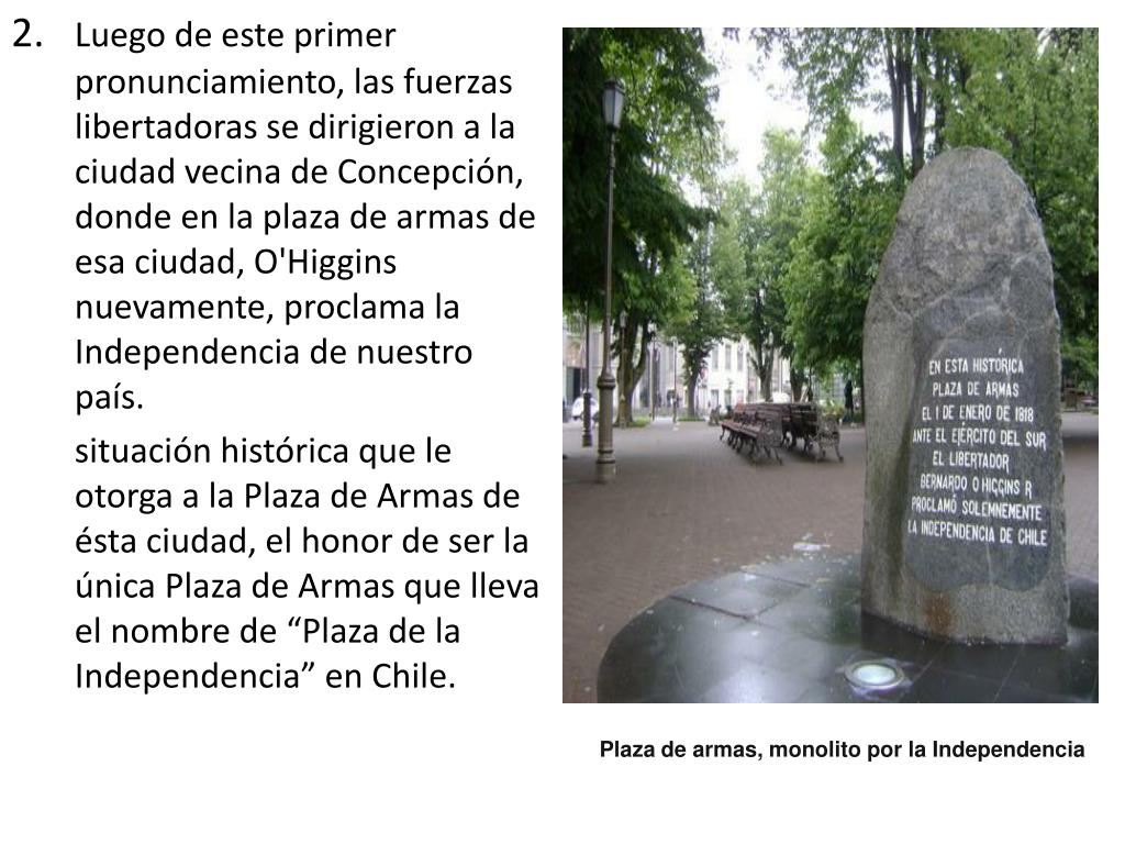 2. Luego de este primer pronunciamiento, las fuerzas libertadoras se dirigieron a la ciudad vecina de Concepción, donde en la plaza de armas de esa ciudad, O'Higgins nuevamente, proclama la Independencia de nuestro país. situación histórica que le otorga a la Plaza de Armas de ésta ciudad, el honor de ser la única Plaza de Armas que lleva el nombre de “Plaza de la Independencia” en Chile. Plaza de armas, monolito por la Independencia