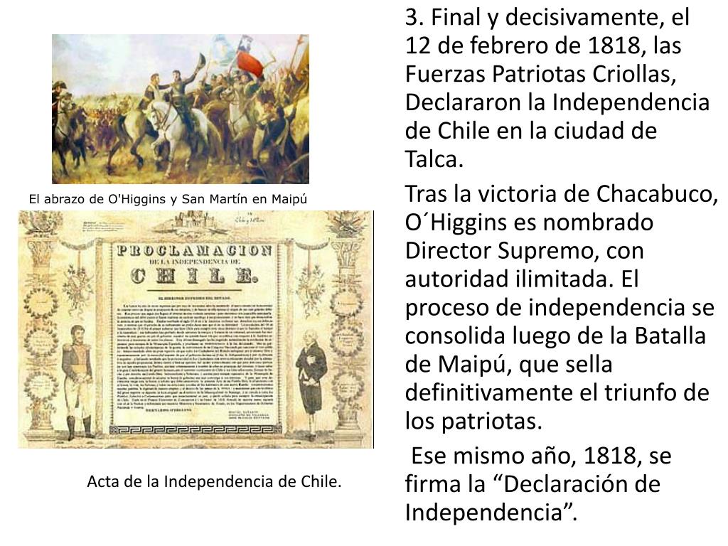 3. Final y decisivamente, el 12 de febrero de 1818, las Fuerzas Patriotas Criollas, Declararon la Independencia de Chile en la ciudad de Talca. Tras la victoria de Chacabuco, O´Higgins es nombrado Director Supremo, con autoridad ilimitada. El proceso de independencia se consolida luego de la Batalla de Maipú, que sella definitivamente el triunfo de los patriotas. Ese mismo año, 1818, se firma la “Declaración de Independencia”. El abrazo de O'Higgins y San Martín en Maipú Acta de la Independencia de Chile.