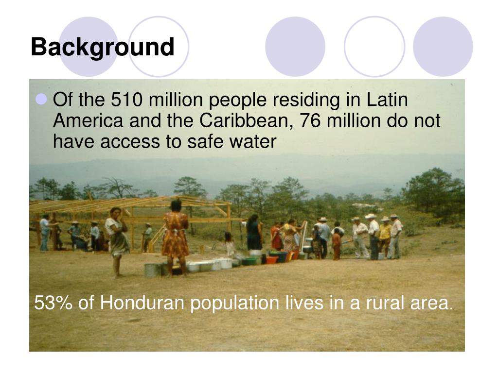 Background • Of the 510 million people residing in Latin America and the Caribbean, 76 million do not have access to safe water 53% of Honduran population lives in a rural area.