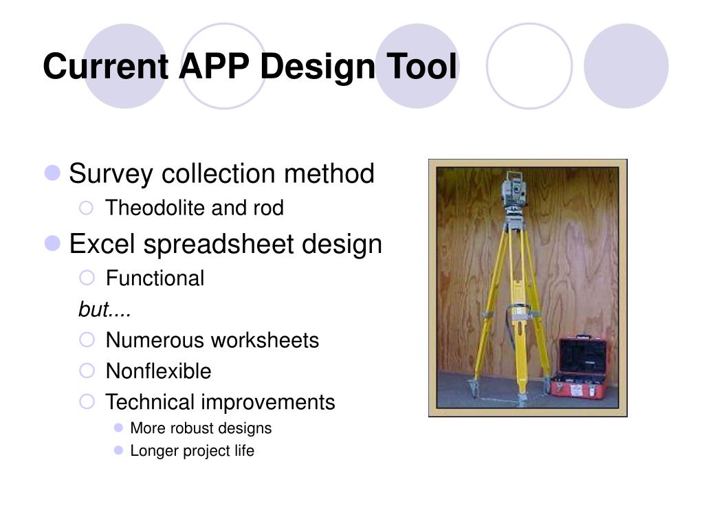 Current APP Design Tool • Survey collection method • Theodolite and rod • Excel spreadsheet design • Functional but.... • Numerous worksheets • Nonflexible • Technical improvements • More robust designs • Longer project life