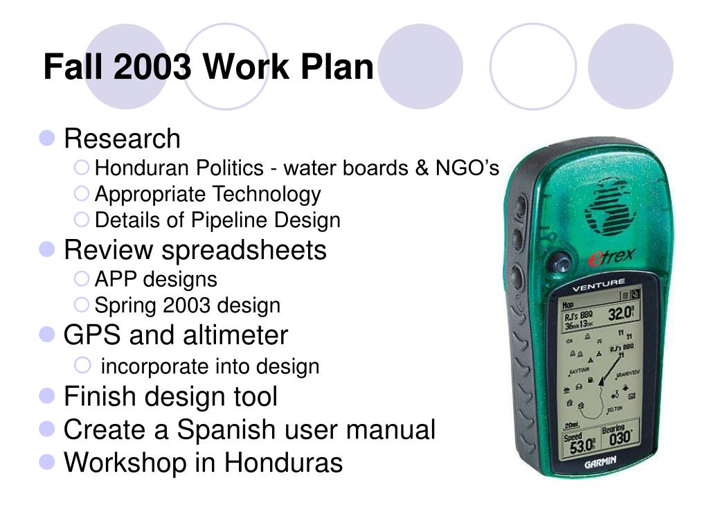 Fall 2003 Work Plan • Research • Honduran Politics - water boards & NGO’s • Appropriate Technology • Details of Pipeline Design • Review spreadsheets • APP designs • Spring 2003 design • GPS and altimeter • incorporate into design • Finish design tool • Create a Spanish user manual • Workshop in Honduras