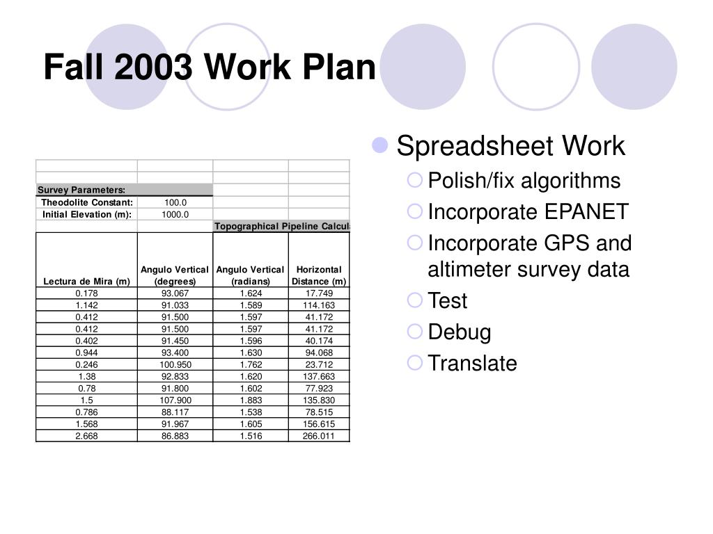Fall 2003 Work Plan • Spreadsheet Work • Polish/fix algorithms • Incorporate EPANET • Incorporate GPS and altimeter survey data • Test • Debug • Translate
