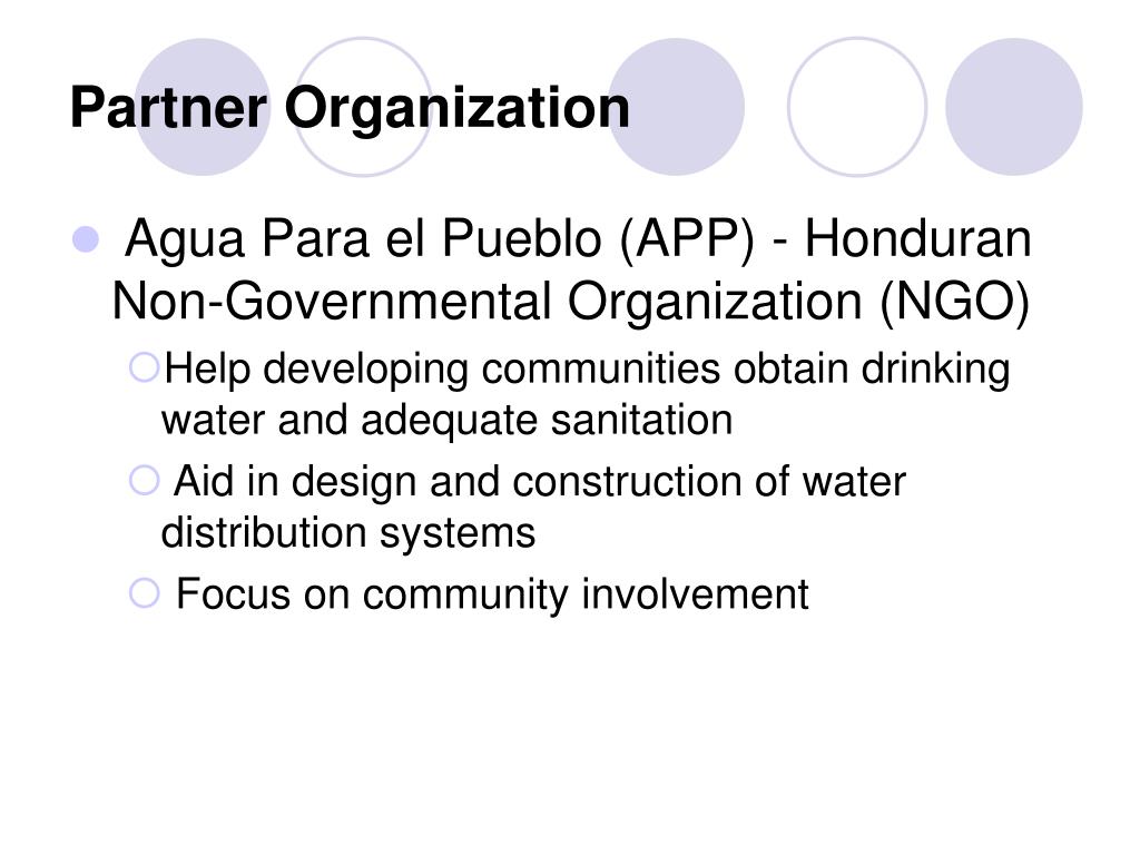 Partner Organization • Agua Para el Pueblo (APP) - Honduran Non-Governmental Organization (NGO) • Help developing communities obtain drinking water and adequate sanitation • Aid in design and construction of water distribution systems • Focus on community involvement