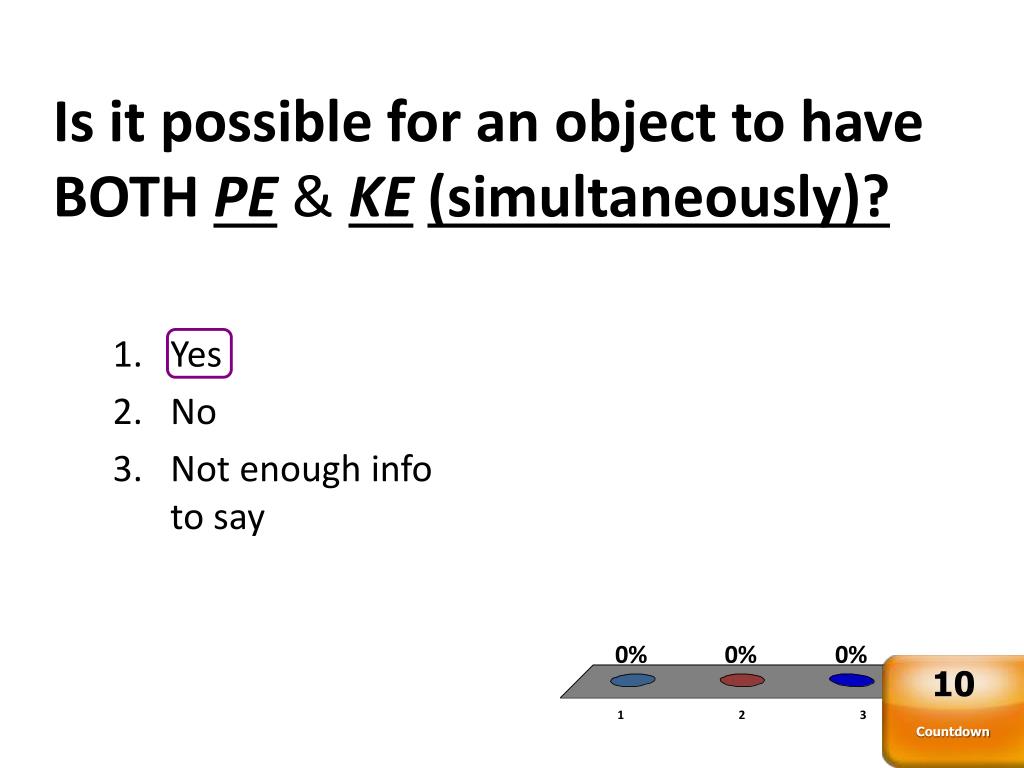 Is it possible for an object to have BOTH PE & KE(simultaneously)? • Yes • No • Not enough info to say 10 Countdown
