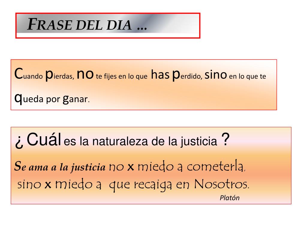 FRASE DEL DIA … Cuando pierdas, no te fijes en lo que hasperdido, sino en lo que te queda por ganar. ¿Cuáles la naturaleza de la justicia ? Se ama a la justiciano x miedo a cometerla, sino xmiedo a que recaiga en Nosotros. Platón