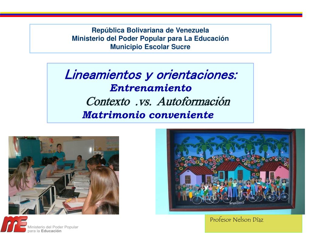 República Bolivariana de VenezuelaMinisterio del Poder Popular para La EducaciónMunicipio Escolar Sucre Lineamientos y orientaciones: Entrenamiento Contexto .vs. Autoformación Matrimonio conveniente Profesor Nelson Díaz