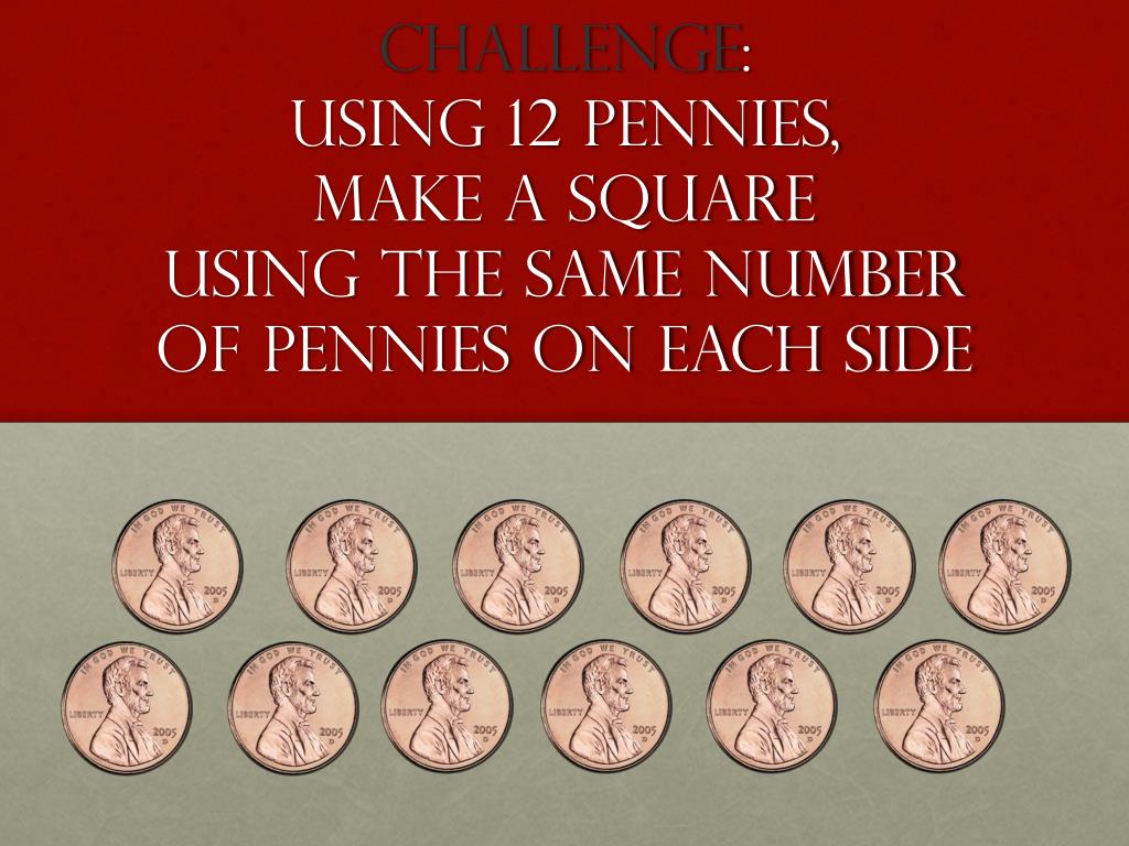 Challenge: USING 12 PENNIES, MAKE A SQUAREusing THE SAME NUMBEROF PENNIES ON EACH SIDE