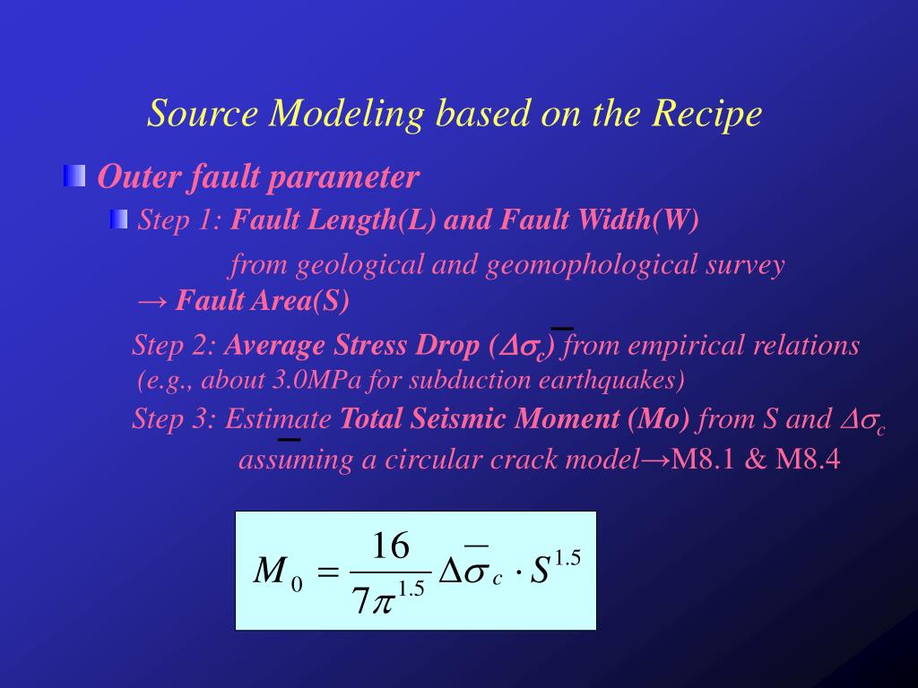 Source Modeling based on the Recipe • Outer fault parameter • Step 1:Fault Length(L) and Fault Width(W) from geological and geomophological survey→ Fault Area(S) Step 2: Average Stress Drop (Dsc) from empirical relations(e.g., about 3.0MPa for subduction earthquakes) Step 3: Estimate Total Seismic Moment (Mo) from S and Dsc assuming a circular crack model→M8.1 & M8.4