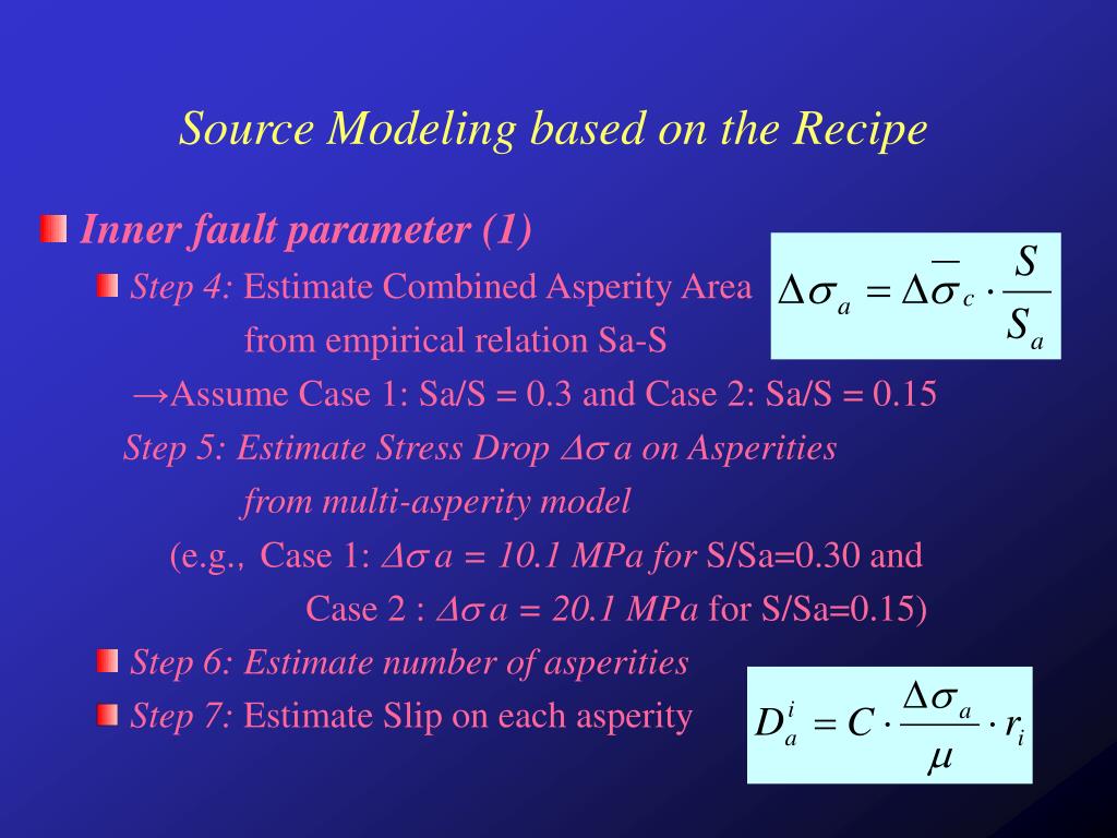 Source Modeling based on the Recipe • Inner fault parameter (1) • Step 4: Estimate Combined Asperity Area from empirical relation Sa-S →Assume Case 1: Sa/S = 0.3 and Case 2: Sa/S = 0.15 Step 5: Estimate Stress Drop Ds a on Asperities from multi-asperity model (e.g.,Case 1: Ds a = 10.1 MPa for S/Sa=0.30 and Case 2 : Ds a = 20.1 MPa for S/Sa=0.15) • Step 6:Estimate number of asperities • Step 7: Estimate Slip on each asperity