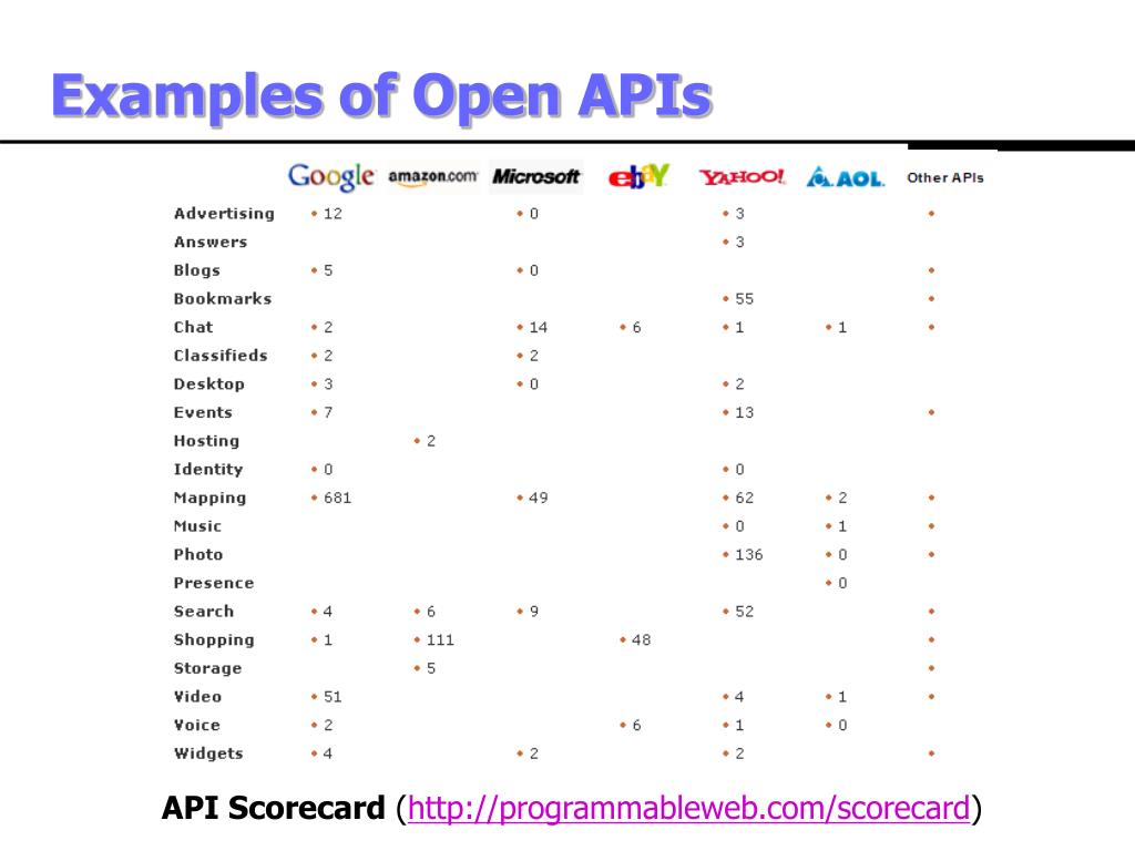 Examples of Open APIs API Scorecard (http://programmableweb.com/scorecard)