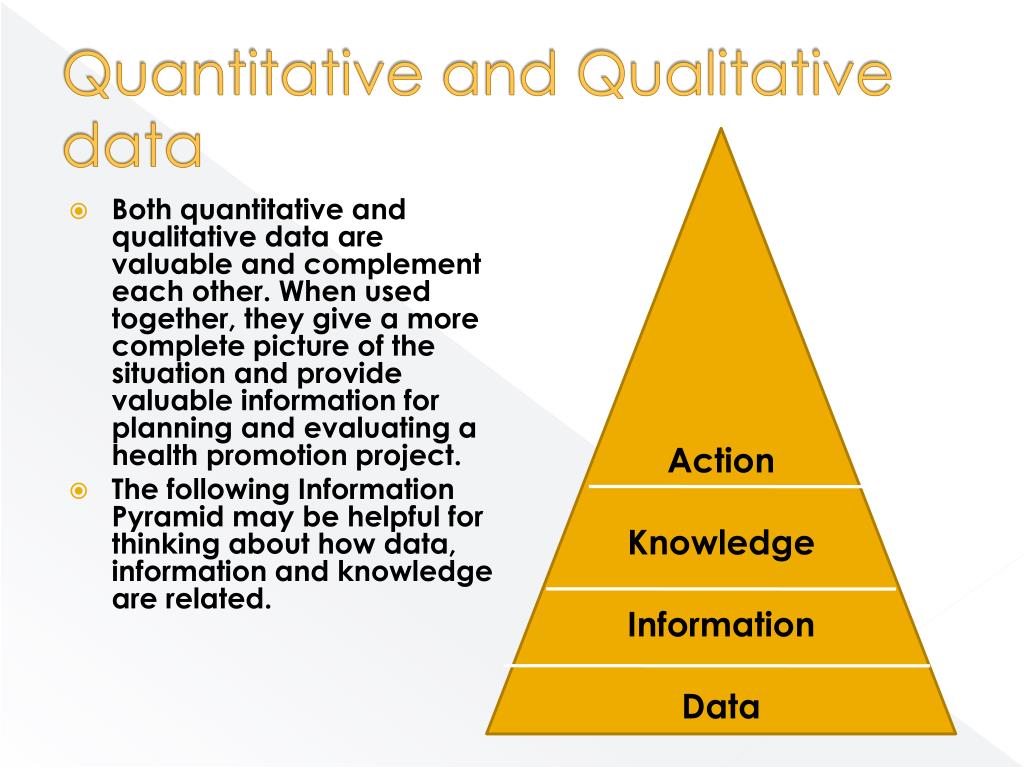 Quantitative and Qualitative data Action Knowledge Information Data • Both quantitative and qualitative data are valuable and complement each other. When used together, they give a more complete picture of the situation and provide valuable information for planning and evaluating a health promotion project. • The following Information Pyramid may be helpful for thinking about how data, information and knowledge are related.