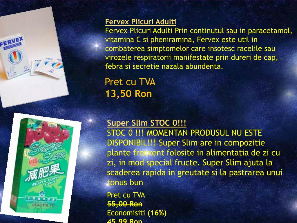 Fervex Plicuri Adulti Fervex Plicuri Adulti Prin continutul sau in paracetamol, vitamina C si pheniramina, Fervex este util in combaterea simptomelor care insotesc racelile sau virozele respiratorii manifestate prin dureri de cap, febra si secretie nazala abundenta. Pret cu TVA 13,50 Ron Super Slim STOC 0!!! STOC 0 !!! MOMENTAN PRODUSUL NU ESTE DISPONIBIL!!! Super Slim are in compozitie plante frecvent folosite in alimentatia de zi cu zi, in mod special fructe. Super Slim ajuta la scaderea rapida in greutate si la pastrarea unui tonus bun Pret cu TVA 55,00 Ron Economisiti (16%) 45,99 Ron