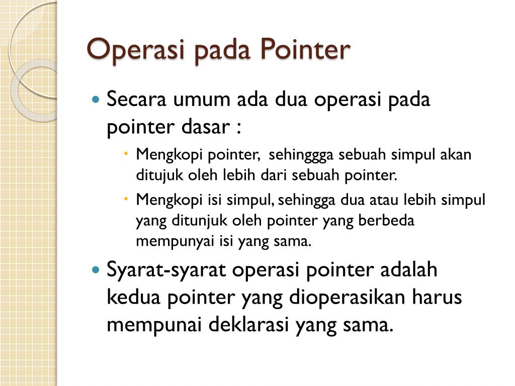 Operasipada Pointer • Secara umum ada dua operasi pada pointer dasar : • Mengkopi pointer, sehinggga sebuah simpul akan ditujuk oleh lebih dari sebuah pointer. • Mengkopi isi simpul, sehingga dua atau lebih simpul yang ditunjuk oleh pointer yang berbeda mempunyai isi yang sama. • Syarat-syarat operasi pointer adalah kedua pointer yang dioperasikan harus mempunai deklarasi yang sama.