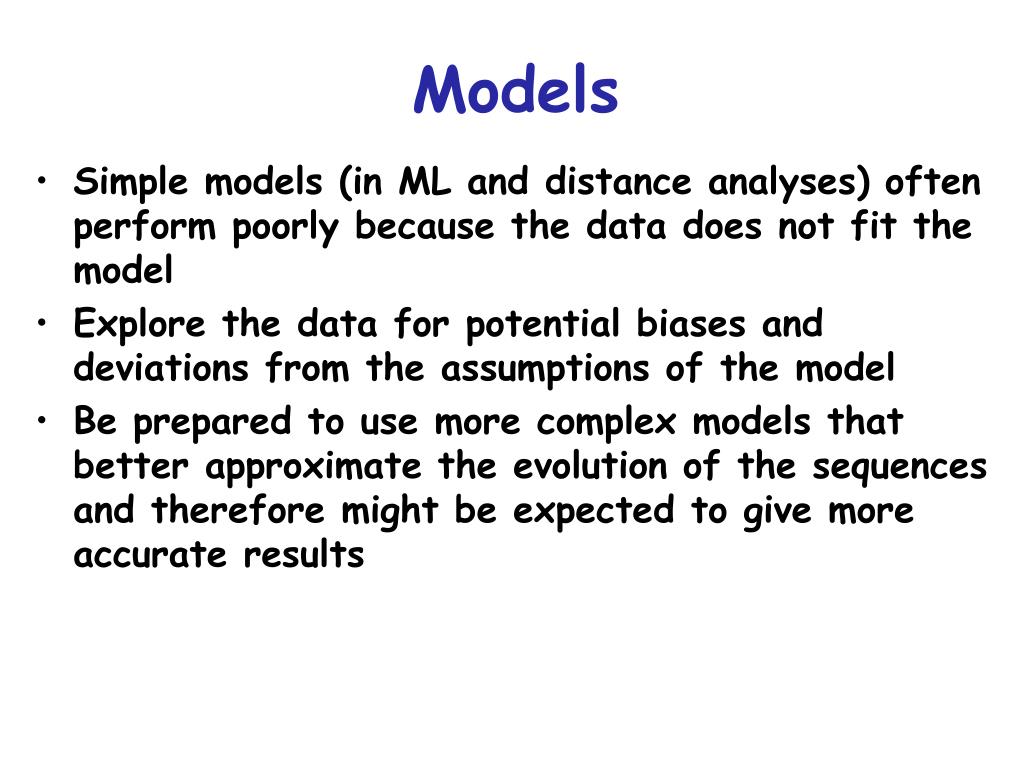 Models • Simple models (in ML and distance analyses) often perform poorly because the data does not fit the model • Explore the data for potential biases and deviations from the assumptions of the model • Be prepared to use more complex models that better approximate the evolution of the sequences and therefore might be expected to give more accurate results