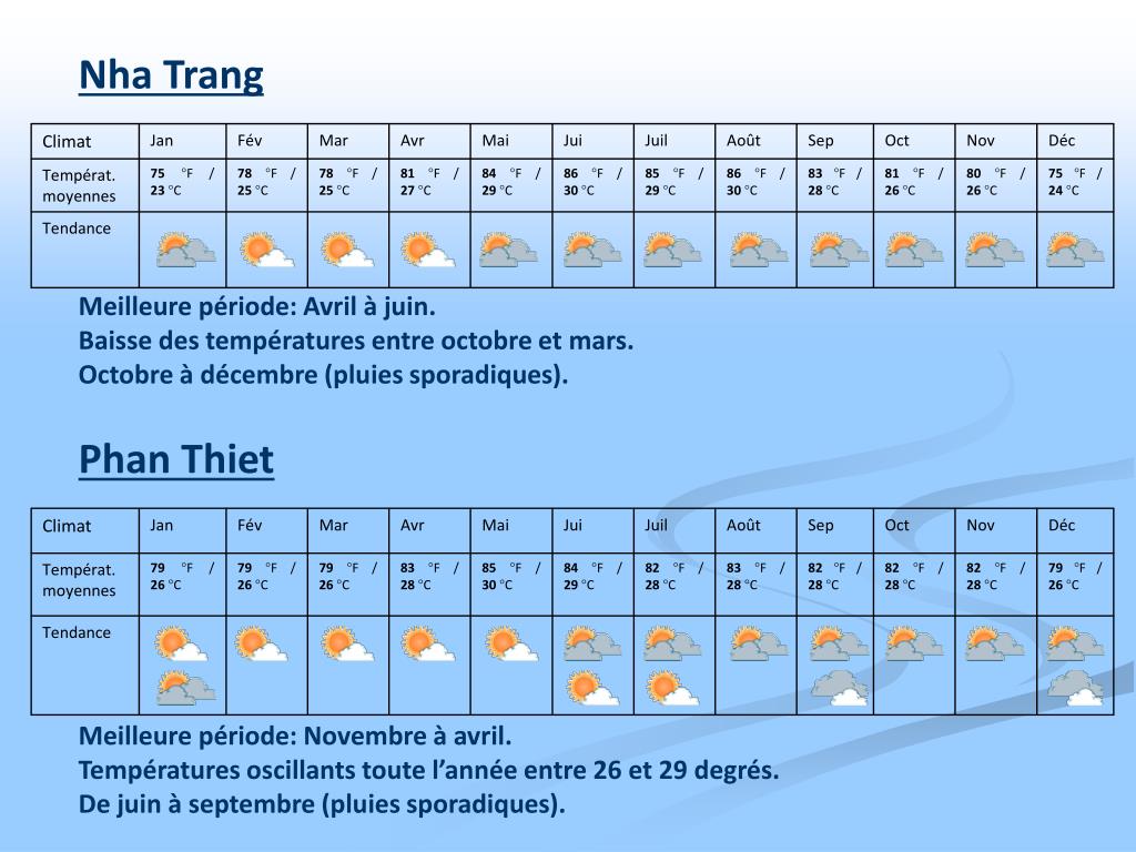Nha Trang Phan Thiet Climat Climat Jan Jan Fév Fév Mar Mar Avr Avr Mai Mai Jui Jui Juil Juil Août Août Sep Sep Oct Oct Nov Nov Déc Déc Températ. moyennes 75 °F / 23 °C 78 °F / 25 °C 78 °F / 25 °C 81 °F / 27 °C 84 °F / 29 °C 86 °F / 30 °C 85 °F / 29 °C 86 °F / 30 °C 83 °F / 28 °C 81 °F / 26 °C 80 °F / 26 °C 75 °F / 24 °C Températ. moyennes 79 °F / 26 °C 79 °F / 26 °C 79 °F / 26 °C 83 °F / 28 °C 85 °F / 30 °C 84 °F / 29 °C 82 °F / 28 °C 83 °F / 28 °C 82 °F / 28 °C 82 °F / 28 °C 82 °F / 28 °C 79 °F / 26 °C Tendance Tendance Meilleure période: Avril à juin. Baisse des températures entre octobre et mars. Octobre à décembre (pluies sporadiques). Meilleure période: Novembre à avril. Températures oscillants toute l’année entre 26 et 29 degrés. De juin à septembre (pluies sporadiques).