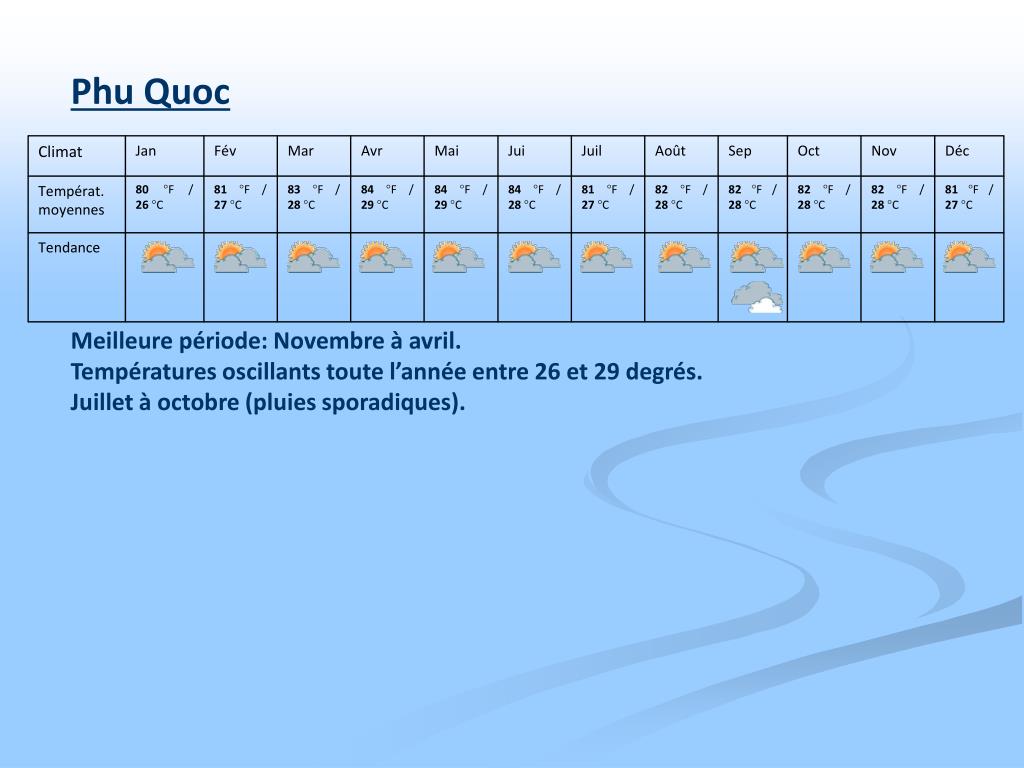 Phu Quoc Climat Jan Fév Mar Avr Mai Jui Juil Août Sep Oct Nov Déc Températ. moyennes 80 °F / 26 °C 81 °F / 27 °C 83 °F / 28 °C 84 °F / 29 °C 84 °F / 29 °C 84 °F / 28 °C 81 °F / 27 °C 82 °F / 28 °C 82 °F / 28 °C 82 °F / 28 °C 82 °F / 28 °C 81 °F / 27 °C Tendance Meilleure période: Novembre à avril. Températures oscillants toute l’année entre 26 et 29 degrés. Juillet à octobre (pluies sporadiques).