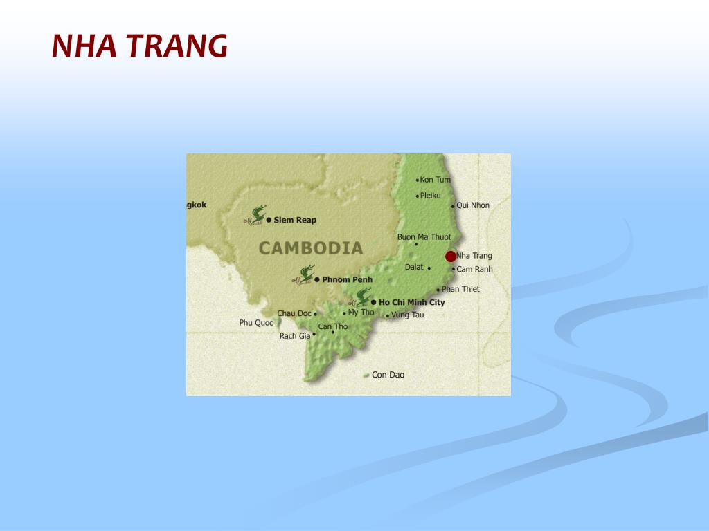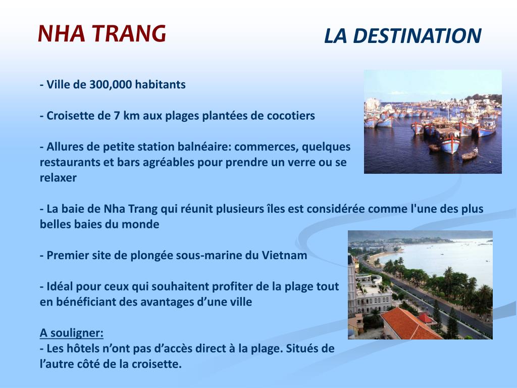 NHA TRANG LA DESTINATION - Ville de 300,000 habitants - Croisette de 7 km aux plages plantées de cocotiers - Allures de petite station balnéaire: commerces, quelques restaurants et bars agréables pour prendre un verre ou se relaxer - La baie de Nha Trang qui réunit plusieurs îles est considérée comme l'une des plus belles baies du monde - Premier site de plongée sous-marine du Vietnam - Idéal pour ceux qui souhaitent profiter de la plage tout en bénéficiant des avantages d’une ville A souligner: - Les hôtels n’ont pas d’accès direct à la plage. Situés de l’autre côté de la croisette.