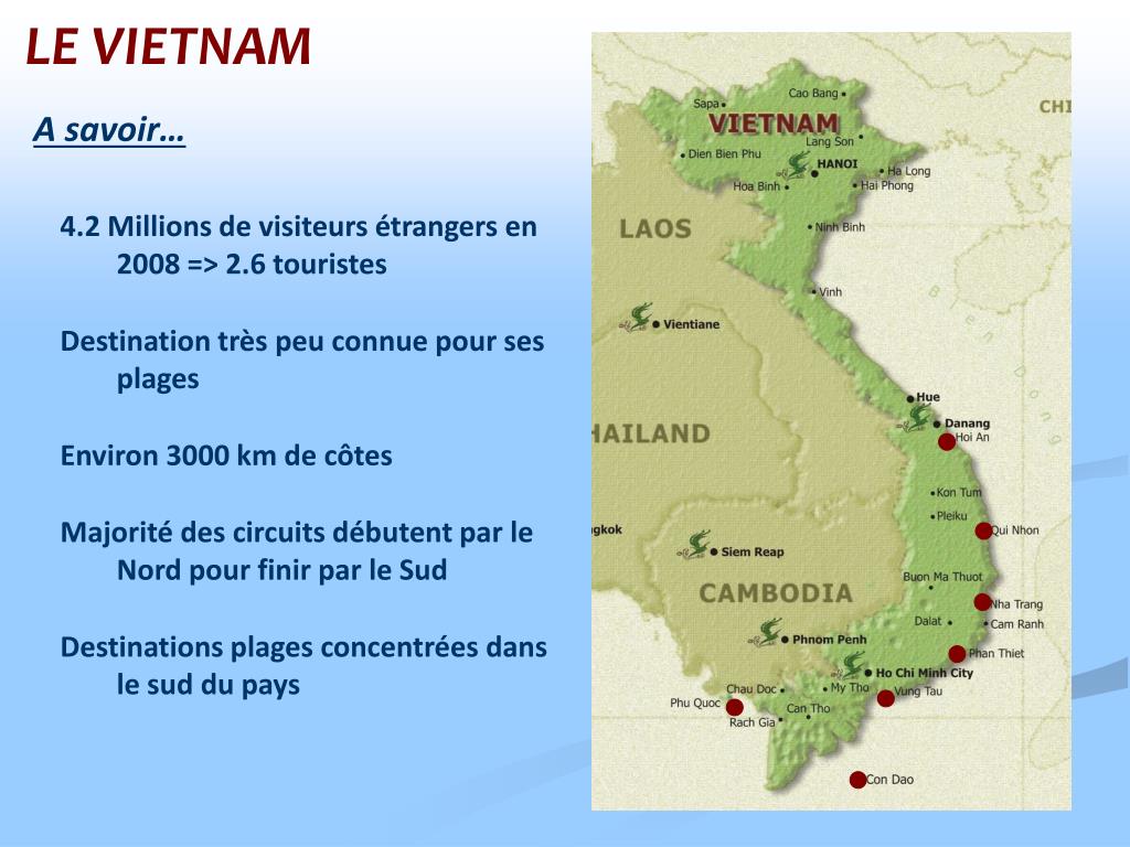 LE VIETNAM A savoir… 4.2 Millions de visiteurs étrangers en 2008 => 2.6 touristes Destination très peu connue pour ses plages Environ 3000 km de côtes Majorité des circuits débutent par le Nord pour finir par le Sud Destinations plages concentrées dans le sud du pays