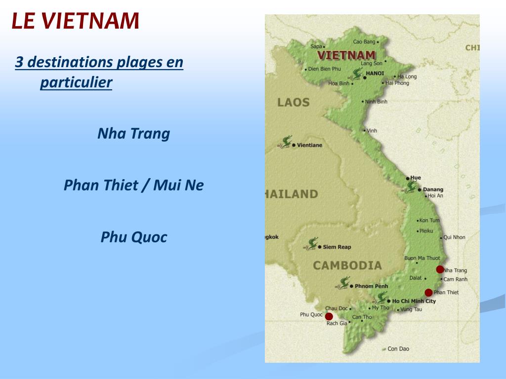 Vendre les destinations plages au Vietnam. Nha Trang, Phan Thiet, Phu Quoc. LE VIETNAM. A savoir…. 4.2 Millions de visiteurs étrangers en 2008 => 2.6 touristes. Destination très peu connue pour ses plages. Environ 3000 km de côtes.