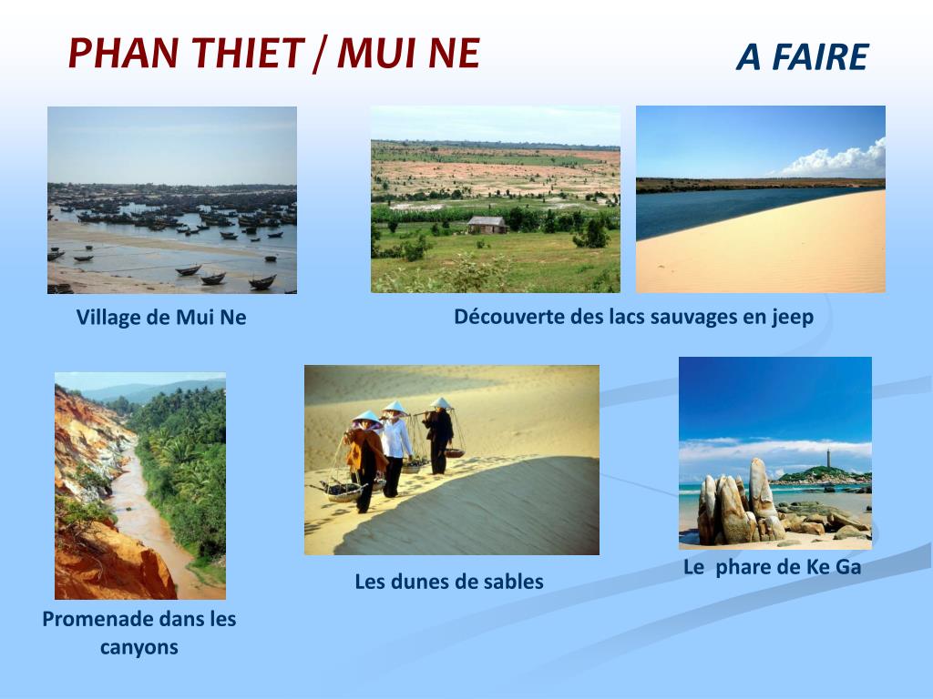 PHAN THIET / MUI NE LA DESTINATION • - Mui Ne: Village de pêcheurs situés à 200 km au nord-est d’Ho Chi Minh Ville situé à 15 km de Phan Thiet • - Plages de sable blanc plantées de cocotiers • - Station balnéaire en pleine expansion • - Hôtels ayant accès direct à la plage • - Ambiance plage avec de plus en plus de restaurants, de bars, de discothèques et échoppes à souvenirs • - Site renommée de kite surf et de planche à voile • - Nombreux sites naturels à visiter • Idéal en famille ou pour ceux qui veulent allier • le farniente à la découverte et/ou au sport.