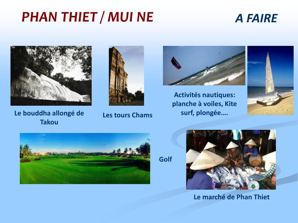 Activités nautiques: planche à voiles, Kite surf, plongée…. Le bouddha allongé de Takou Les tours Chams Golf Le marché de Phan Thiet PHAN THIET / MUI NE A FAIRE