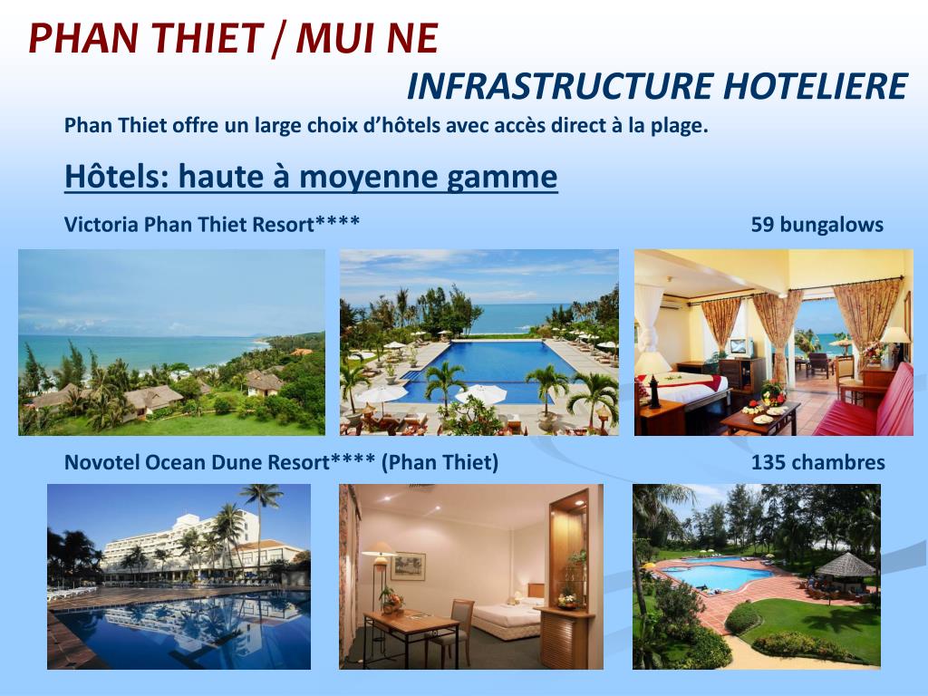 Victoria Phan Thiet Resort**** 59 bungalows Novotel Ocean Dune Resort**** (Phan Thiet) 135 chambres PHAN THIET / MUI NE INFRASTRUCTURE HOTELIERE Phan Thiet offre un large choix d’hôtels avec accès direct à la plage. Hôtels: haute à moyenne gamme