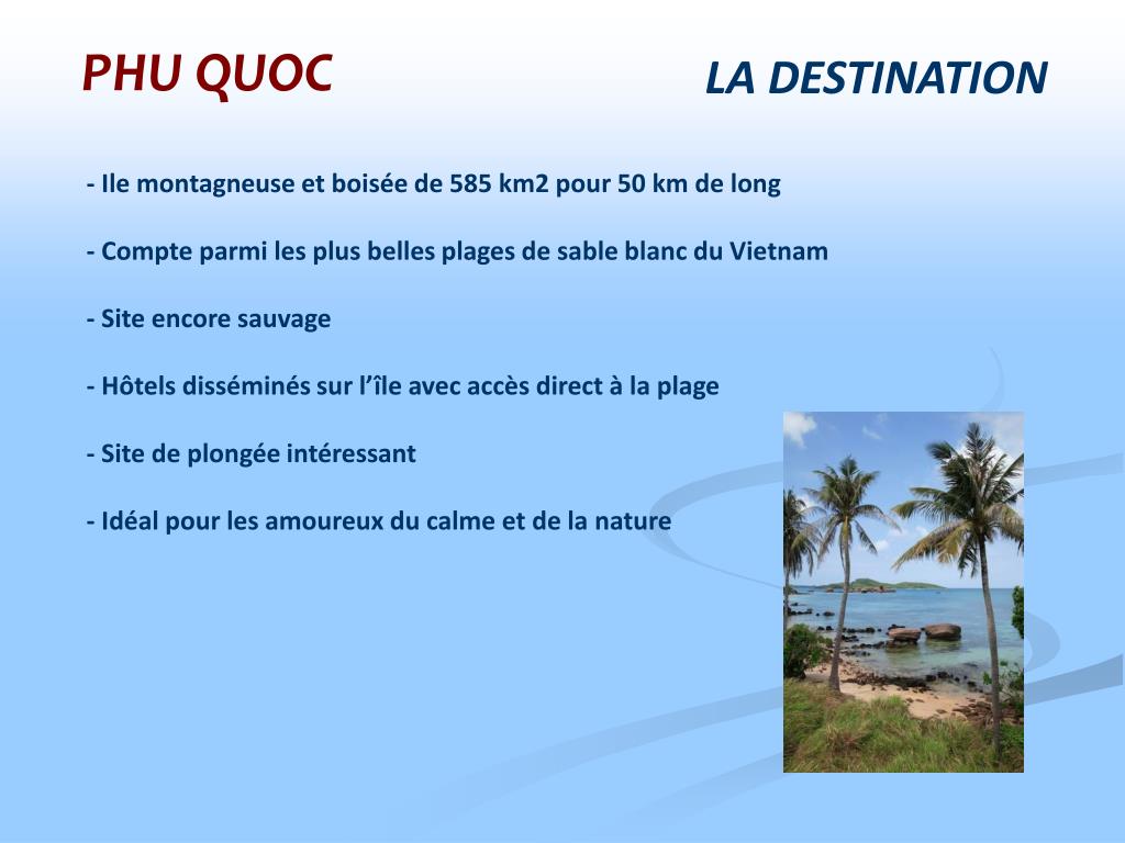 PHU QUOC LA DESTINATION - Ile montagneuse et boisée de 585 km2 pour 50 km de long - Compte parmi les plus belles plages de sable blanc du Vietnam - Site encore sauvage - Hôtels disséminés sur l’île avec accès direct à la plage - Site de plongée intéressant - Idéal pour les amoureux du calme et de la nature