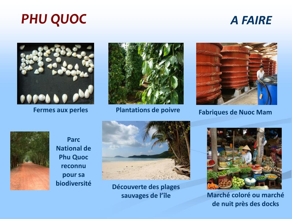 Fermes aux perles Plantations de poivre Fabriques de Nuoc Mam Parc National de Phu Quoc reconnu pour sa biodiversité Marché coloré ou marché de nuit près des docks Découverte des plages sauvages de l’île PHU QUOC A FAIRE