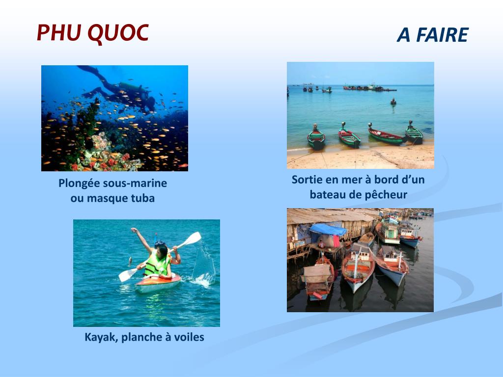 Sortie en mer à bord d’un bateau de pêcheur Plongée sous-marine ou masque tuba Kayak, planche à voiles PHU QUOC A FAIRE