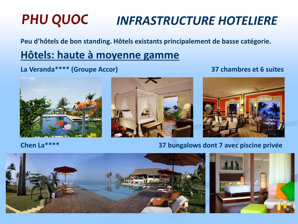 La Veranda**** (Groupe Accor) 37 chambres et 6 suites Chen La**** 37 bungalows dont 7 avec piscine privée PHU QUOC INFRASTRUCTURE HOTELIERE Peu d’hôtels de bon standing. Hôtels existants principalement de basse catégorie. Hôtels: haute à moyenne gamme