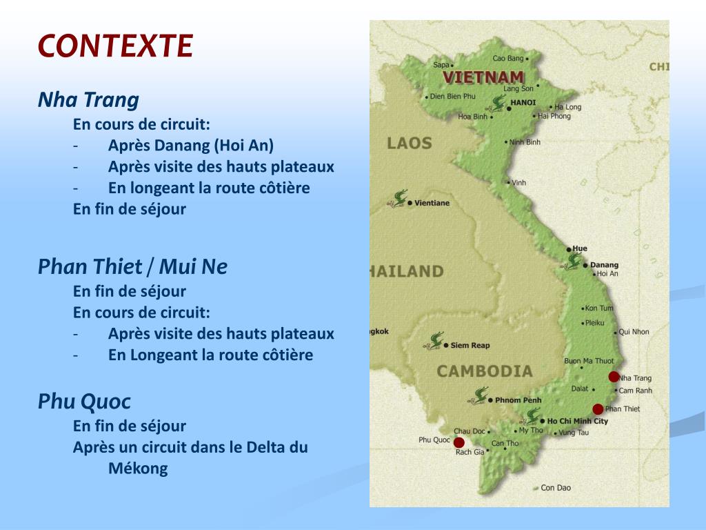 CONTEXTE • Nha Trang • En cours de circuit: • Après Danang (Hoi An) • Après visite des hauts plateaux • En longeant la route côtière • En fin de séjour • Phan Thiet / Mui Ne • En fin de séjour • En cours de circuit: • Après visite des hauts plateaux • En Longeant la route côtière • Phu Quoc • En fin de séjour • Après un circuit dans le Delta du Mékong