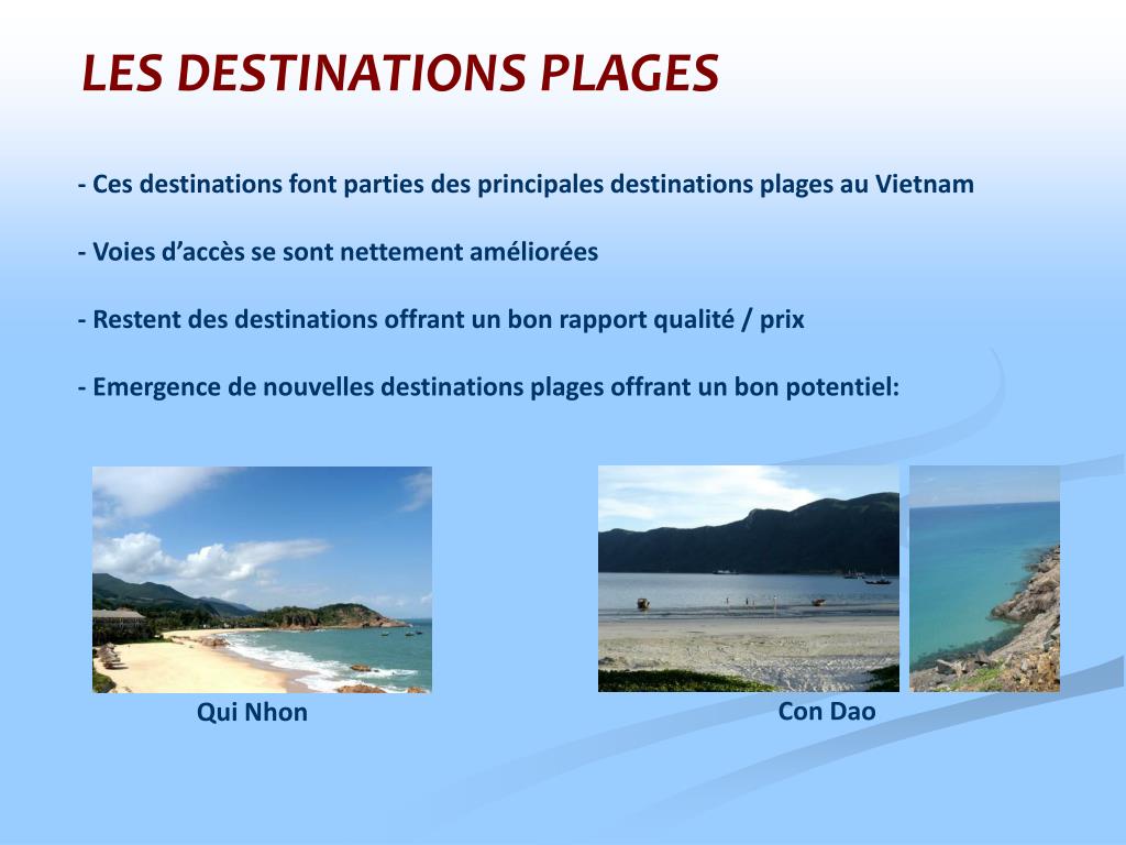 Con Dao LES DESTINATIONS PLAGES • - Ces destinations font parties des principales destinations plages au Vietnam • - Voies d’accès se sont nettement améliorées • - Restent des destinations offrant un bon rapport qualité / prix • - Emergence de nouvelles destinations plages offrant un bon potentiel: Qui Nhon