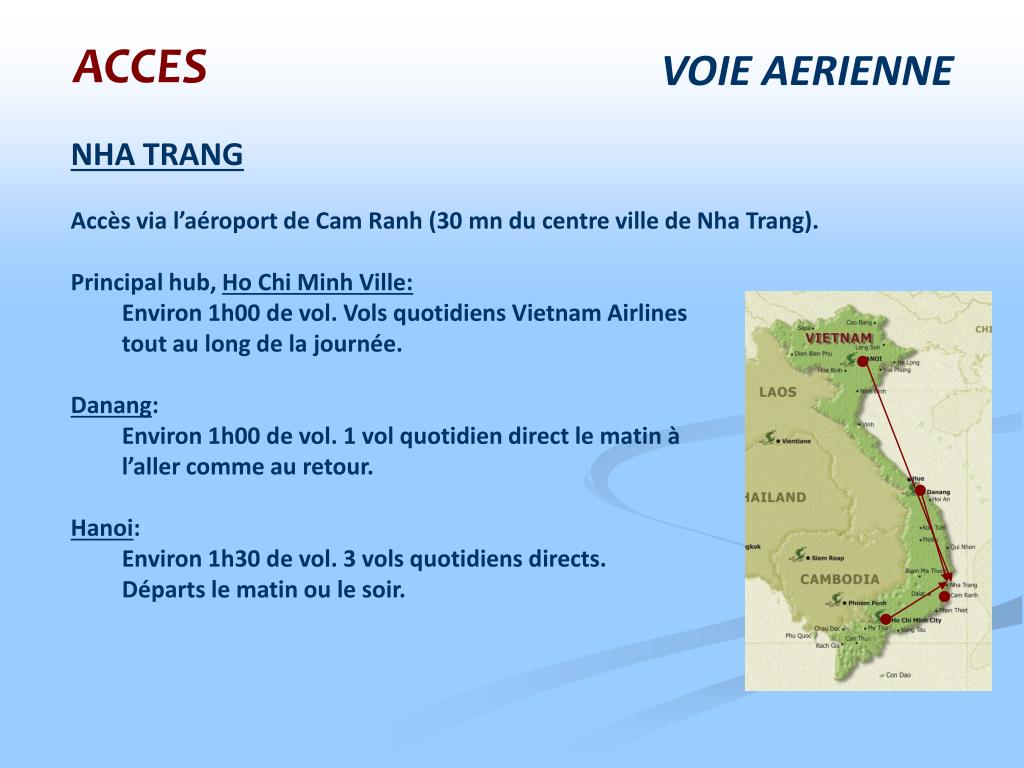 ACCES VOIE AERIENNE • NHA TRANG • Accès via l’aéroport de Cam Ranh (30 mn du centre ville de Nha Trang). • Principal hub, Ho Chi Minh Ville: • Environ 1h00 de vol. Vols quotidiens Vietnam Airlines • tout au long de la journée. • Danang: • Environ 1h00 de vol. 1 vol quotidien direct le matin à • l’aller comme au retour. • Hanoi: • Environ 1h30 de vol. 3 vols quotidiens directs. • Départs le matin ou le soir.