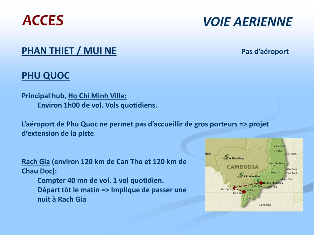 ACCES VOIE AERIENNE PHAN THIET / MUI NEPas d’aéroport • PHU QUOC • Principal hub, Ho Chi Minh Ville: • Environ 1h00 de vol. Vols quotidiens. • L’aéroport de Phu Quoc ne permet pas d’accueillir de gros porteurs => projet d’extension de la piste • Rach Gia (environ 120 km de Can Tho et 120 km de • Chau Doc): • Compter 40 mn de vol. 1 vol quotidien. • Départ tôt le matin => Implique de passer une • nuit à Rach Gia