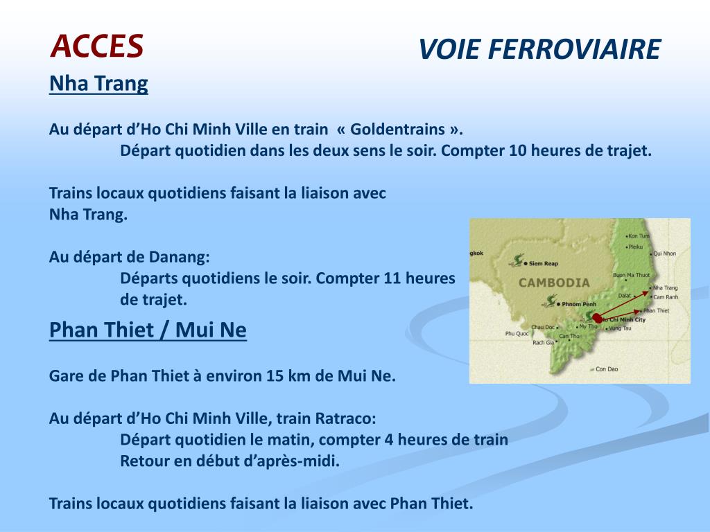 ACCES VOIE FERROVIAIRE • Nha Trang • Au départ d’Ho Chi Minh Ville en train « Goldentrains ». • Départ quotidien dans les deux sens le soir. Compter 10 heures de trajet. • Trains locaux quotidiens faisant la liaison avec • Nha Trang. • Au départ de Danang: • Départs quotidiens le soir. Compter 11 heures • de trajet. • Phan Thiet / Mui Ne • Gare de Phan Thiet à environ 15 km de Mui Ne. • Au départ d’Ho Chi Minh Ville, train Ratraco: • Départ quotidien le matin, compter 4 heures de train • Retour en début d’après-midi. • Trains locaux quotidiens faisant la liaison avec Phan Thiet.