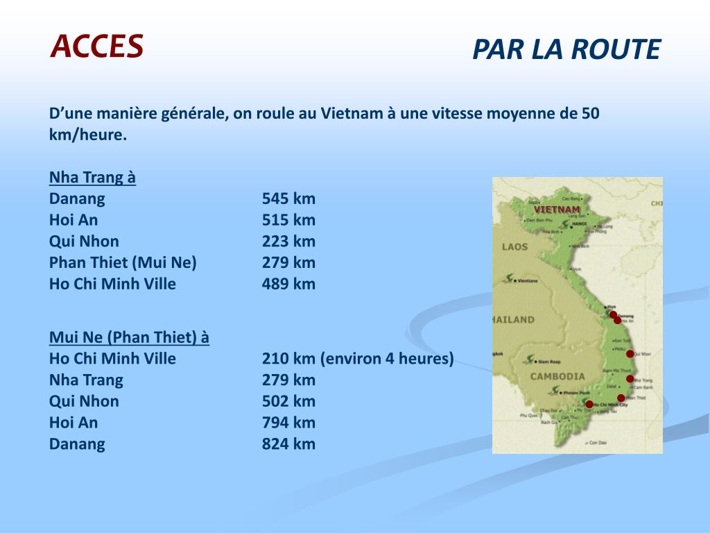 ACCES PAR LA ROUTE D’une manière générale, on roule au Vietnam à une vitesse moyenne de 50 km/heure. Nha Trang à Danang 545 km Hoi An 515 km Qui Nhon 223 km Phan Thiet (Mui Ne) 279 km Ho Chi Minh Ville 489 km Mui Ne (Phan Thiet) à Ho Chi Minh Ville 210 km (environ 4 heures) Nha Trang 279 km Qui Nhon 502 km Hoi An 794 km Danang 824 km