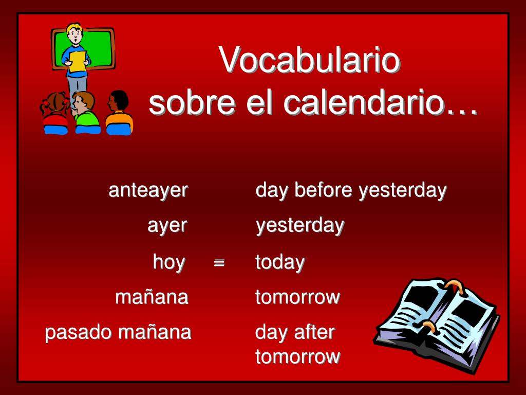 Vocabulario sobre el calendario… anteayer day before yesterday ayer yesterday hoy = today mañana tomorrow pasado mañana day after tomorrow
