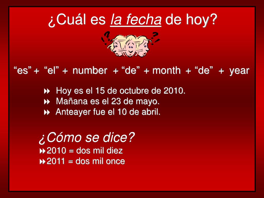 ¿Cuál es la fecha de hoy? + “el” + number + “de” + month + “de” + year “es” • Hoy es el 15 de octubre de 2010. • Mañanaes el 23 de mayo. • Anteayerfue el 10 de abril. ¿Cómo se dice? • 2010 = dos mil diez • 2011 = dos mil once
