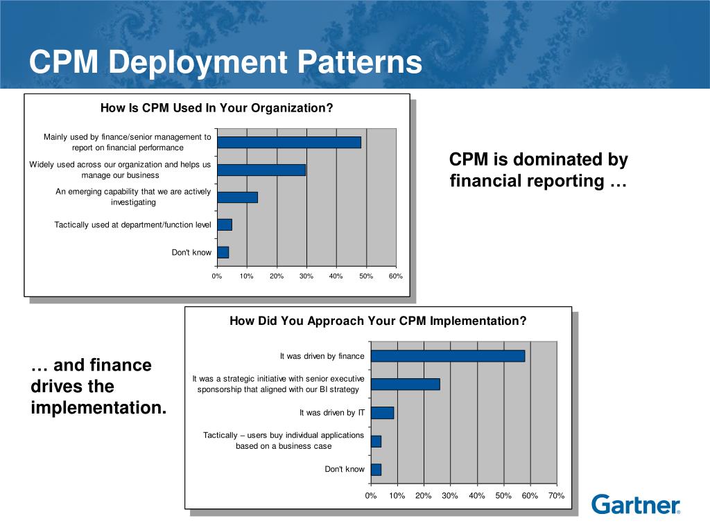 CPM Deployment Patterns CPM is dominated by financial reporting … … and finance drives the implementation.
