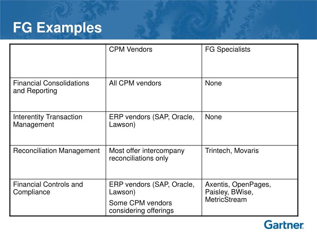 FG — Emerging Market "GRC for the CFO" • Parallel path for CPM, along with BI/PM and a subset of GRC market • Includes applications that provide control, analysis, reconciliation and risk/compliance management • Not a holistic market at present, but clearly developing • Includes: • Financial consolidation • Intercompany transaction management • Reconciliation management • Financial controls and compliance • Financial close management ("the last mile of finance") • Access and segregation of duties controls • Financial risk management • Financial and audit analytics