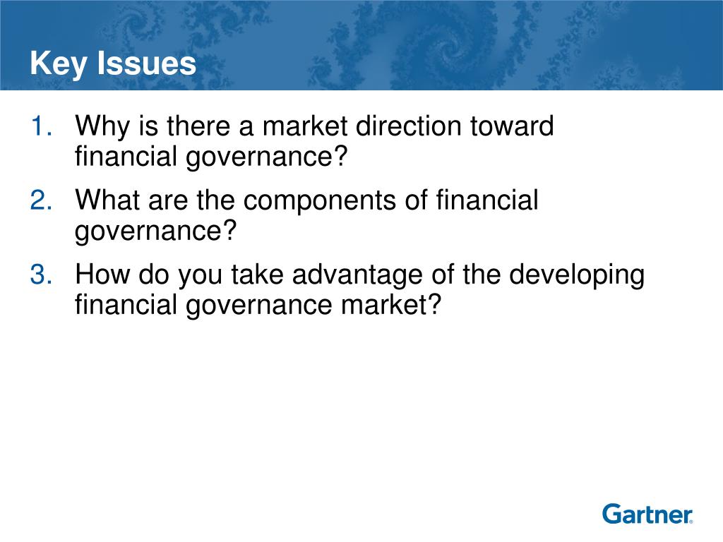 Key Issues 1. Why is there a market direction toward financial governance? 2. What are the components of financial governance? 3. How do you take advantage of the developing financial governance market?