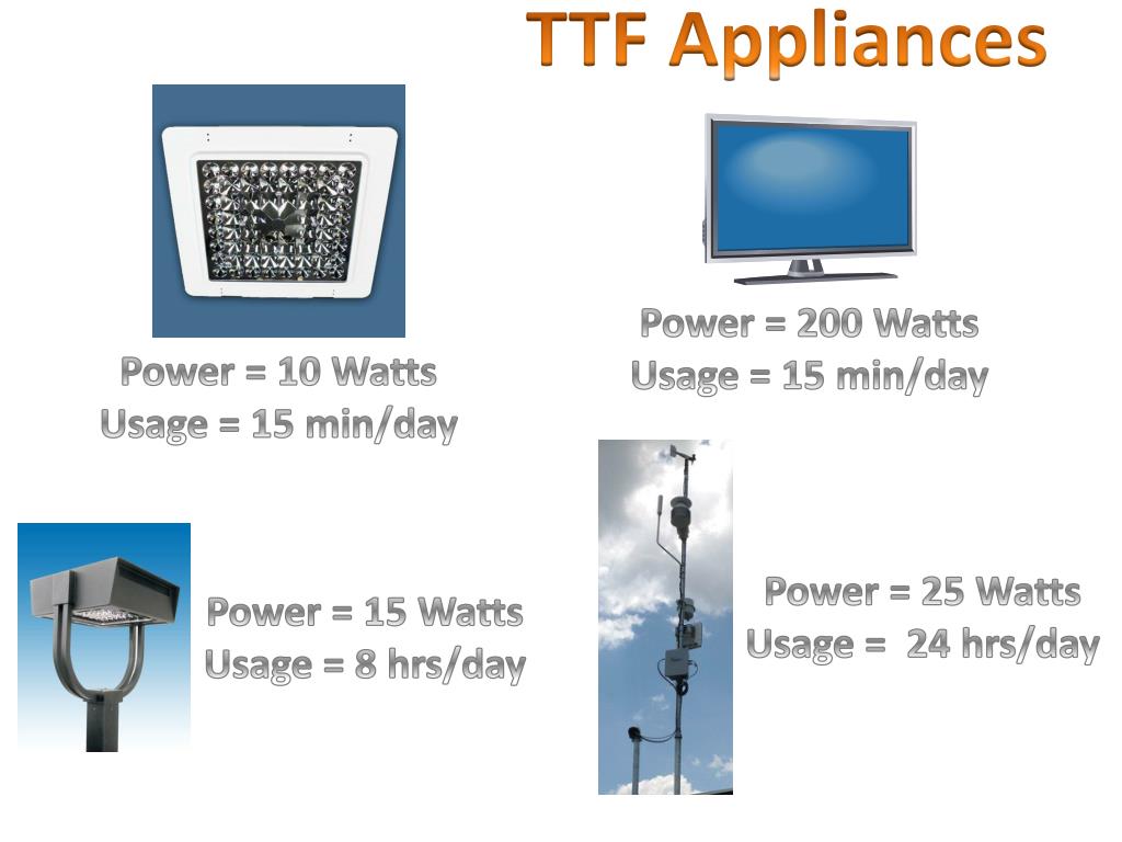 TTF Appliances Power = 200 Watts Usage = 15 min/day Power = 10 Watts Usage = 15 min/day Power = 25 Watts Usage = 24 hrs/day Power = 15 Watts Usage = 8 hrs/day
