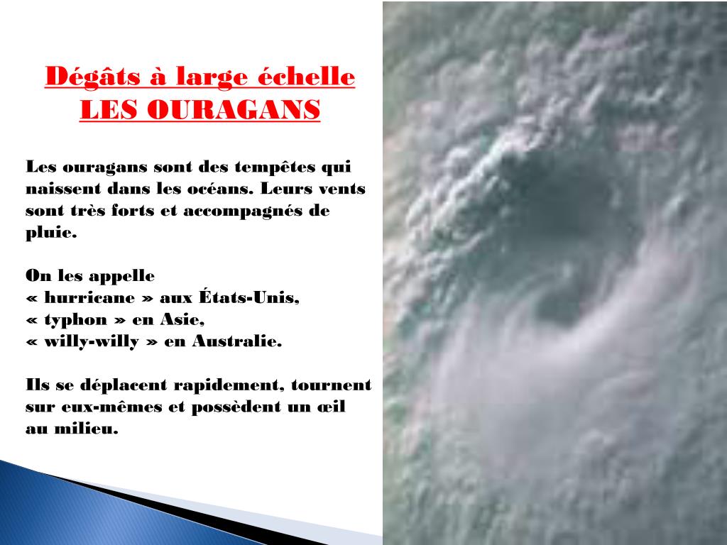 Dégâts à large échelle • LES OURAGANS • Les ouraganssont des tempêtes qui naissentdans les océans. Leurs vents sonttrès forts et accompagnés de pluie. • On les appelle • « hurricane » aux États-Unis, • « typhon » en Asie, • « willy-willy » en Australie. • Ils se déplacent rapidement, tournent sur eux-mêmes et possèdent un œil au milieu.