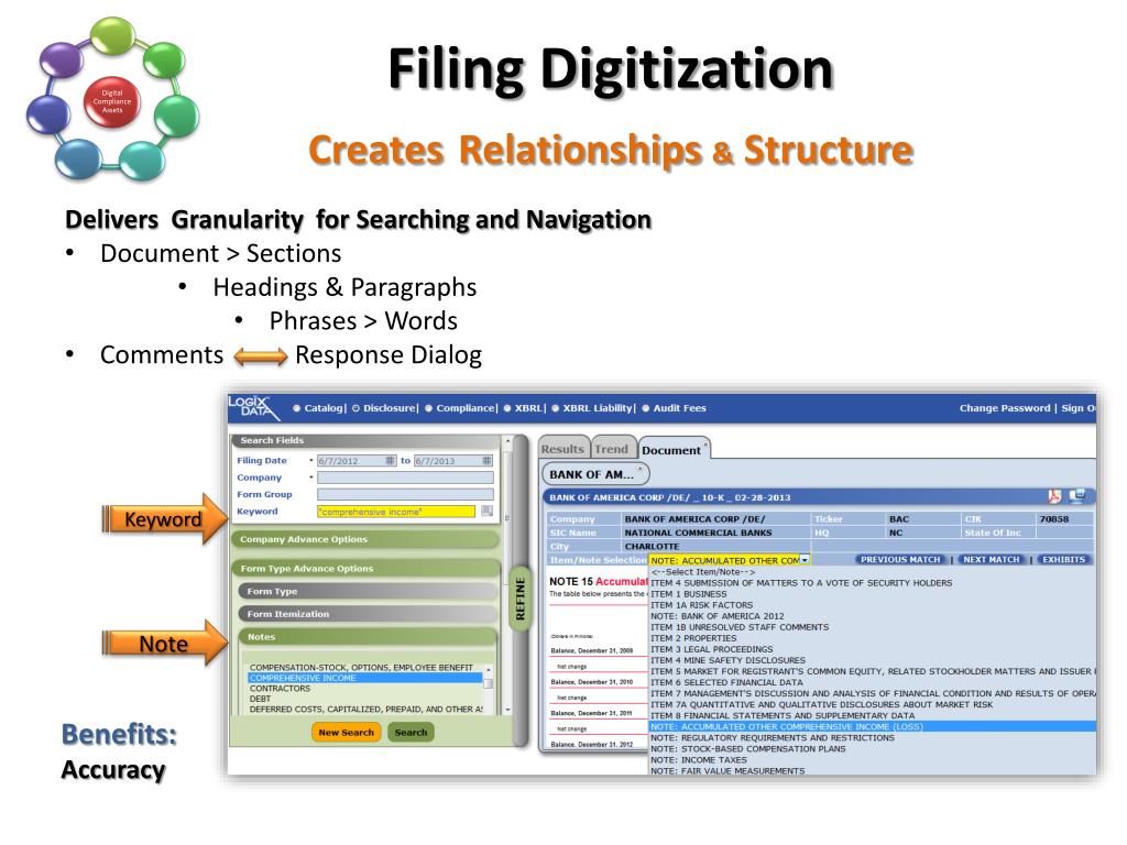Filing DigitizationCreatesRelationships & Structure • Delivers Granularity for Searching and Navigation • Document > Sections • Headings & Paragraphs • Phrases > Words • Comments Response Dialog Keyword Note Benefits: Accuracy